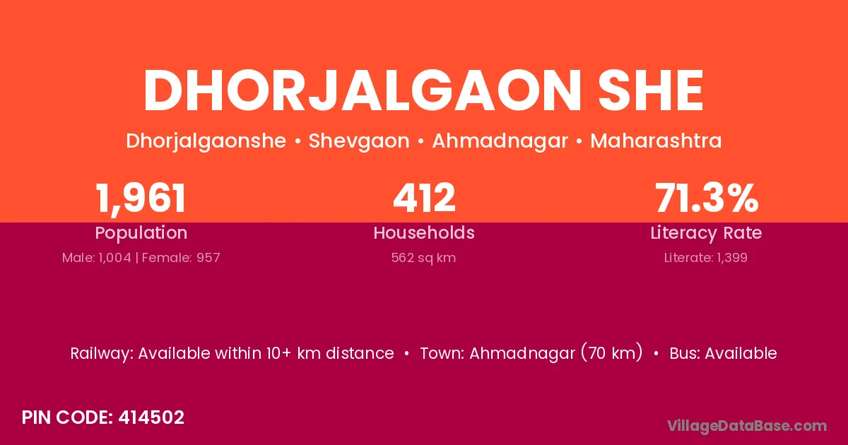 Ahmadnagar (70 km) is the nearest town to Dhorjalgaon She village for major economic activities and is located approximately 70 km away.