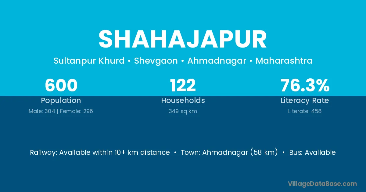 Ahmadnagar (58 km) is the nearest town to Shahajapur village for major economic activities and is located approximately 58 km away.