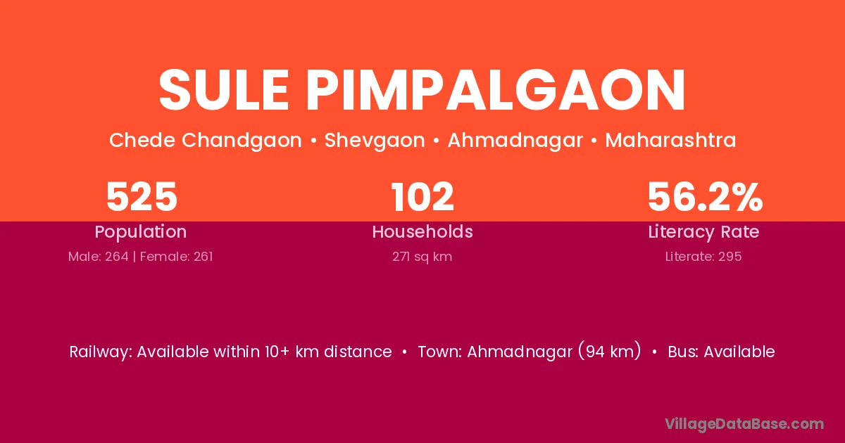 Sule Pimpalgaon village has a total population of 525 people, of which 264 are males and 261 are females.