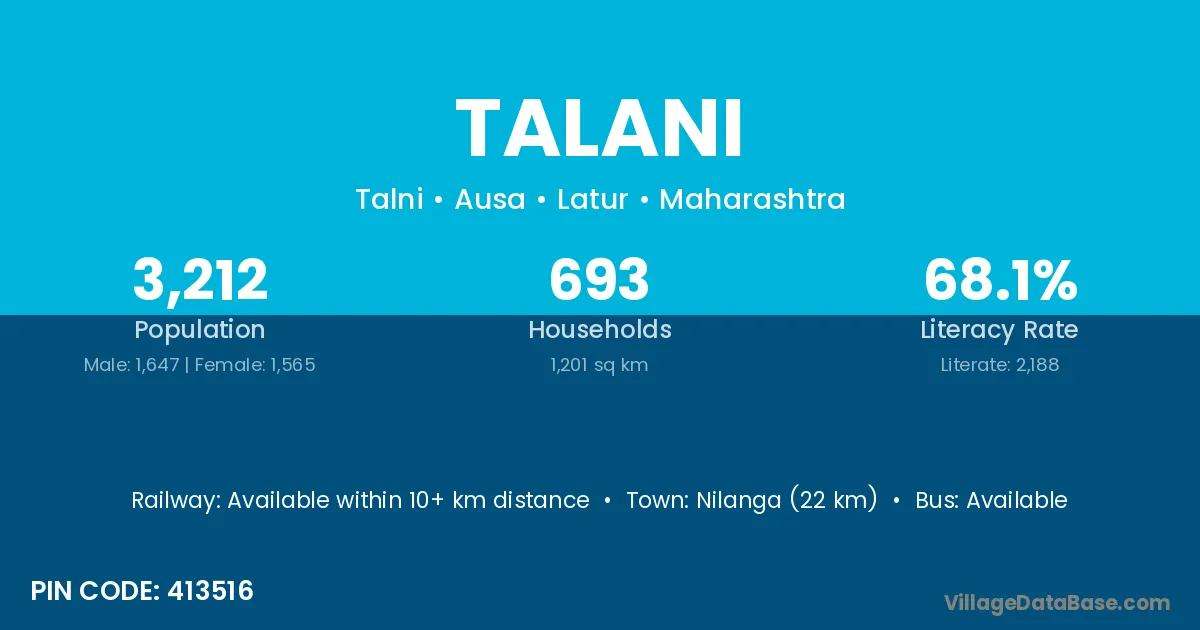 Ahmadnagar (71 km) is the nearest town to Talani village for major economic activities and is located approximately 71 km away.