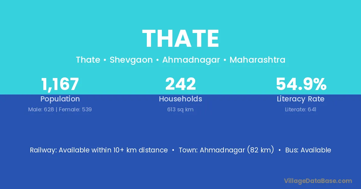 Ahmadnagar (82 km) is the nearest town to Thate village for major economic activities and is located approximately 82 km away.