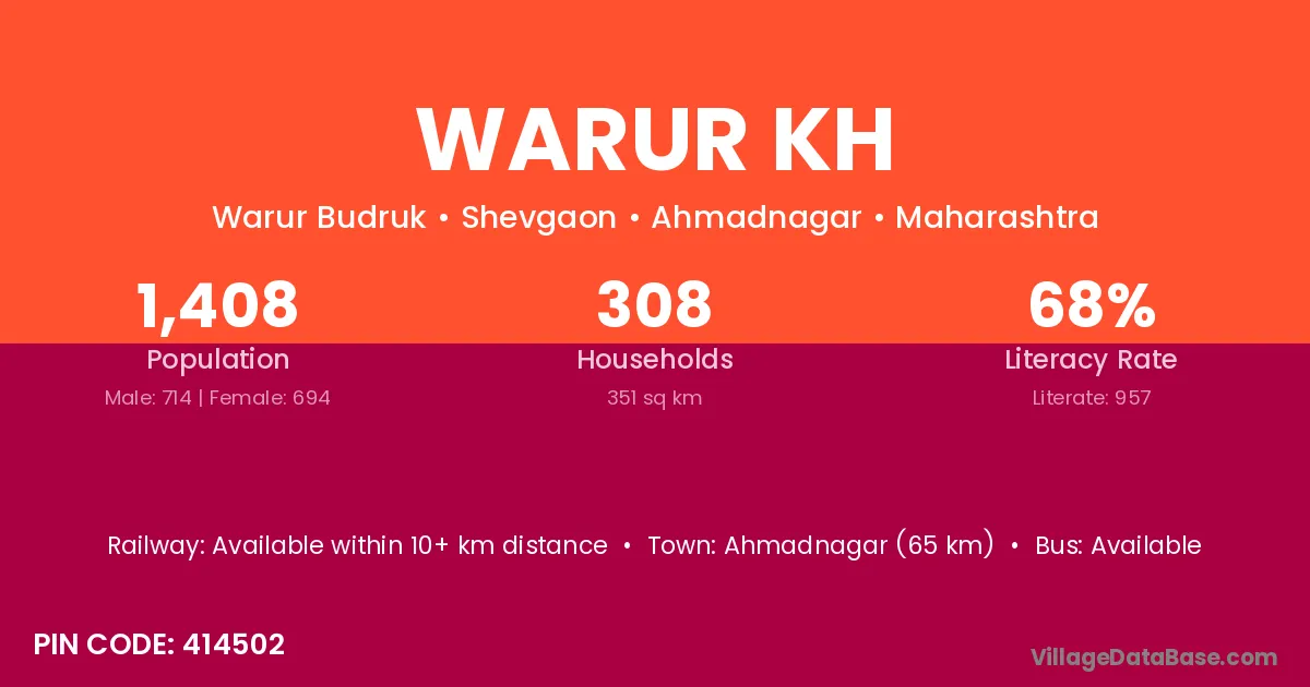 Ahmadnagar (65 km) is the nearest town to Warur Kh village for major economic activities and is located approximately 65 km away.