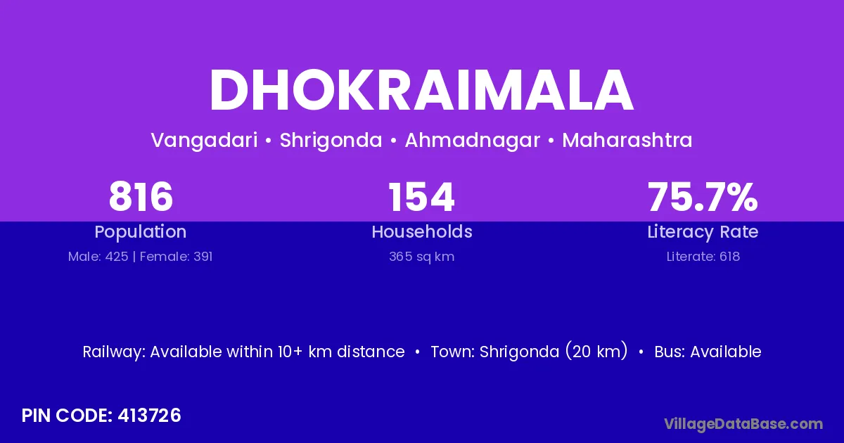 Shrigonda (20 km) is the nearest town to Dhokraimala village for major economic activities and is located approximately 20 km away.