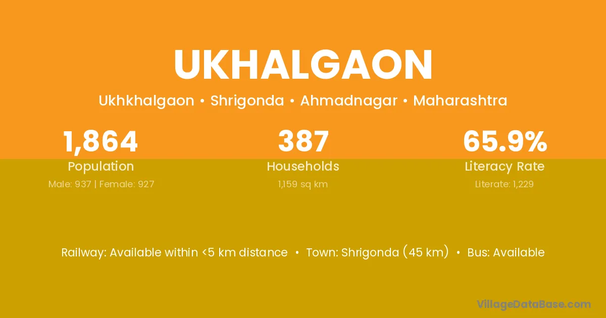 Shrigonda (45 km) is the nearest town to Ukhalgaon village for major economic activities and is located approximately 45 km away.