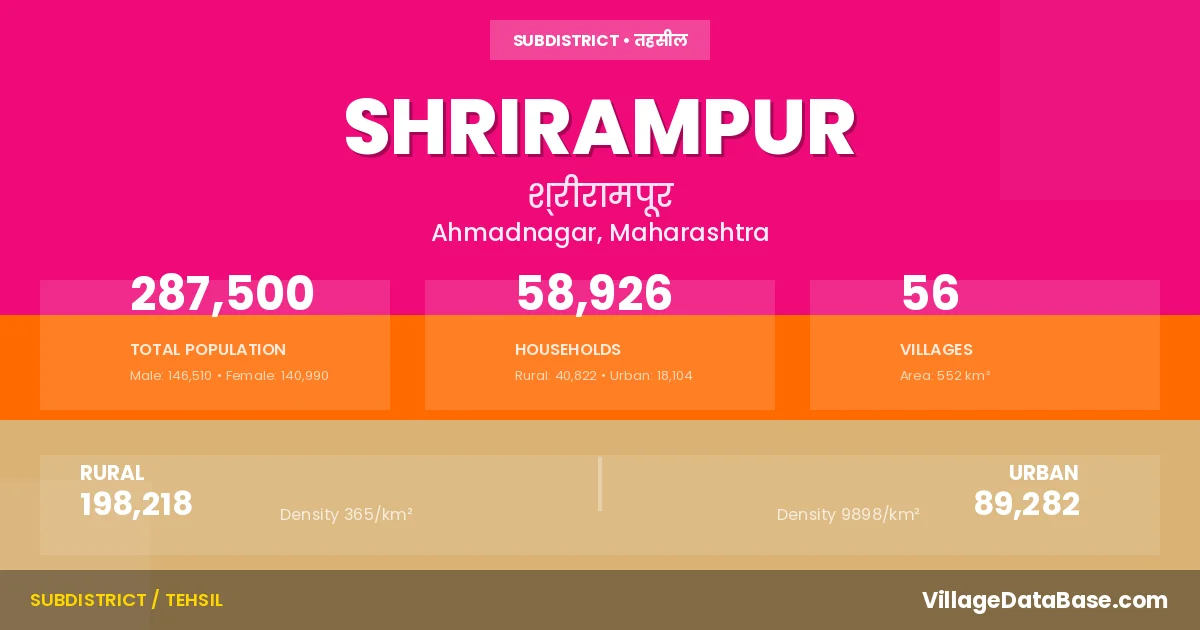 According to the 2011 census The total area of Shrirampur Tehsil is 552 km², with a population of 287500 people. The population density is 521 inhabitants per square kilometre, and there are approximately 58926 houses in the sub district.