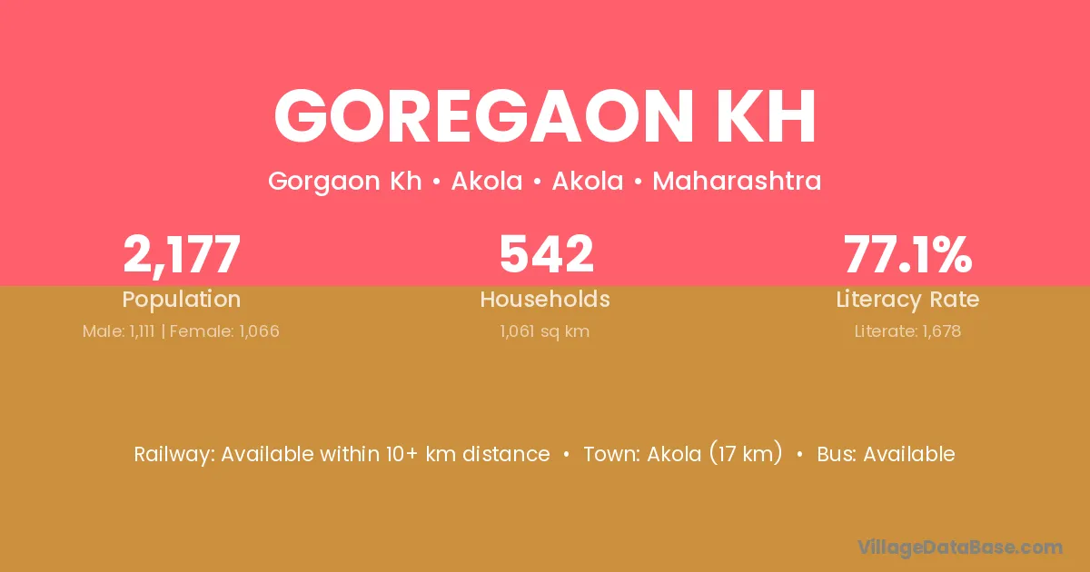 Akola (17 km) is the nearest town to Goregaon Kh village for major economic activities and is located approximately 17 km away.