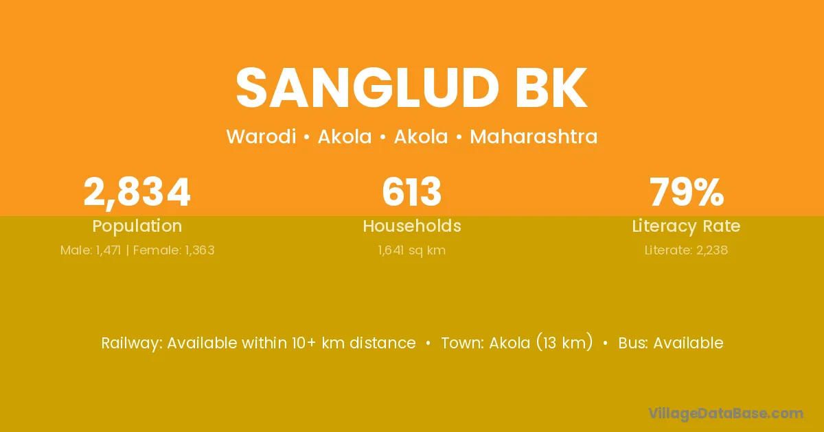 Akola (13 km) is the nearest town to Sanglud Bk village for major economic activities and is located approximately 13 km away.