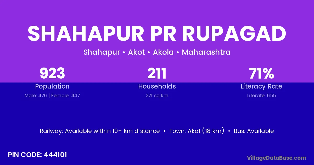 Shahapur Pr Rupagad village has a total population of 923 people, of which 476 are males and 447 are females.