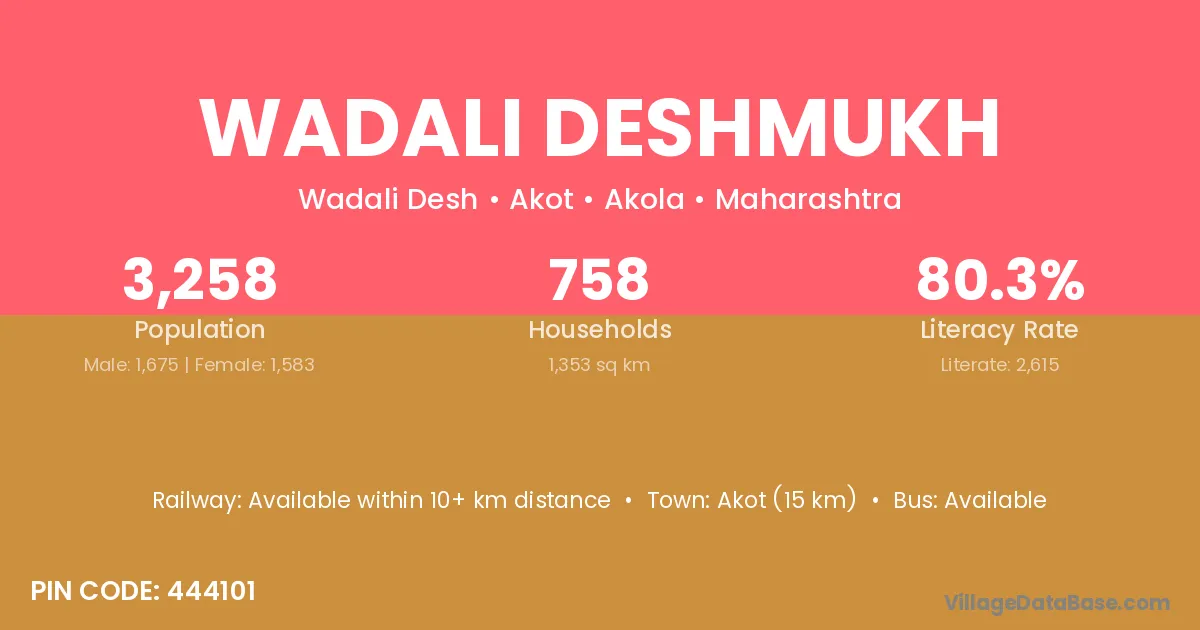 Akot (15 km) is the nearest town to Wadali Deshmukh village for major economic activities and is located approximately 15 km away.