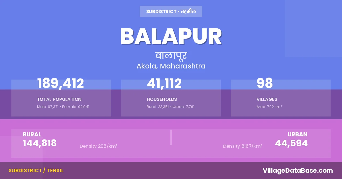 According to the 2011 census The total area of Balapur Tehsil is 702 km², with a population of 189412 people. The population density is 270 inhabitants per square kilometre, and there are approximately 41112 houses in the sub district.