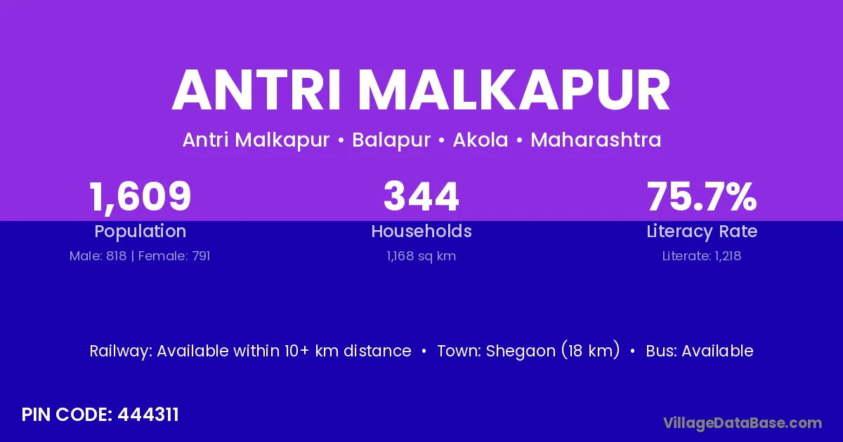 Shegaon (18 km) is the nearest town to Antri Malkapur village for major economic activities and is located approximately 18 km away.