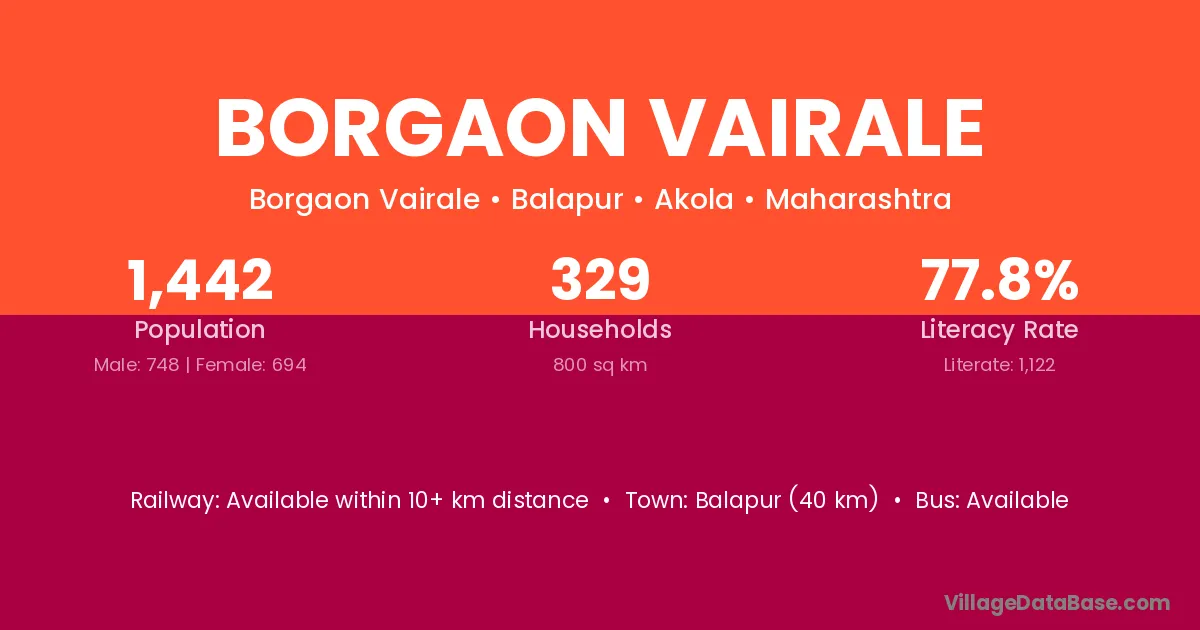 Balapur (40 km) is the nearest town to Borgaon Vairale village for major economic activities and is located approximately 40 km away.