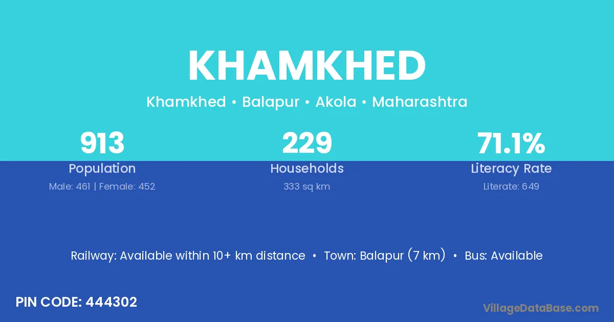 Khamkhed village has a total population of 913 people, of which 461 are males and 452 are females.