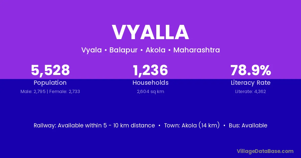 Akola (14 km) is the nearest town to Vyalla village for major economic activities and is located approximately 14 km away.