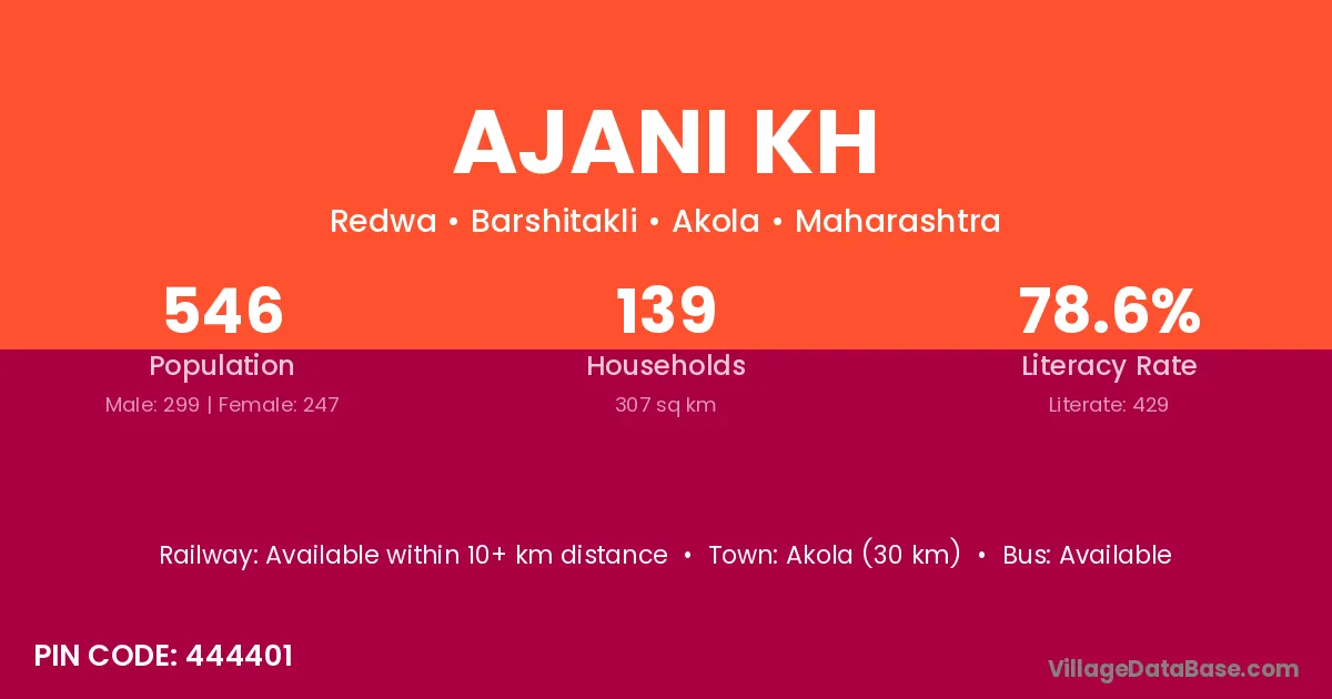 Akola (30 km) is the nearest town to Ajani Kh village for major economic activities and is located approximately 30 km away.