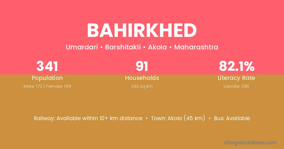 Akola (45 km) is the nearest town to Bahirkhed village for major economic activities and is located approximately 45 km away.