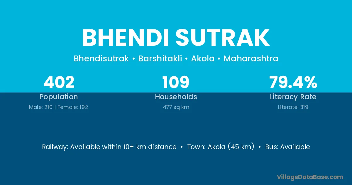 Akola (45 km) is the nearest town to Bhendi Sutrak village for major economic activities and is located approximately 45 km away.