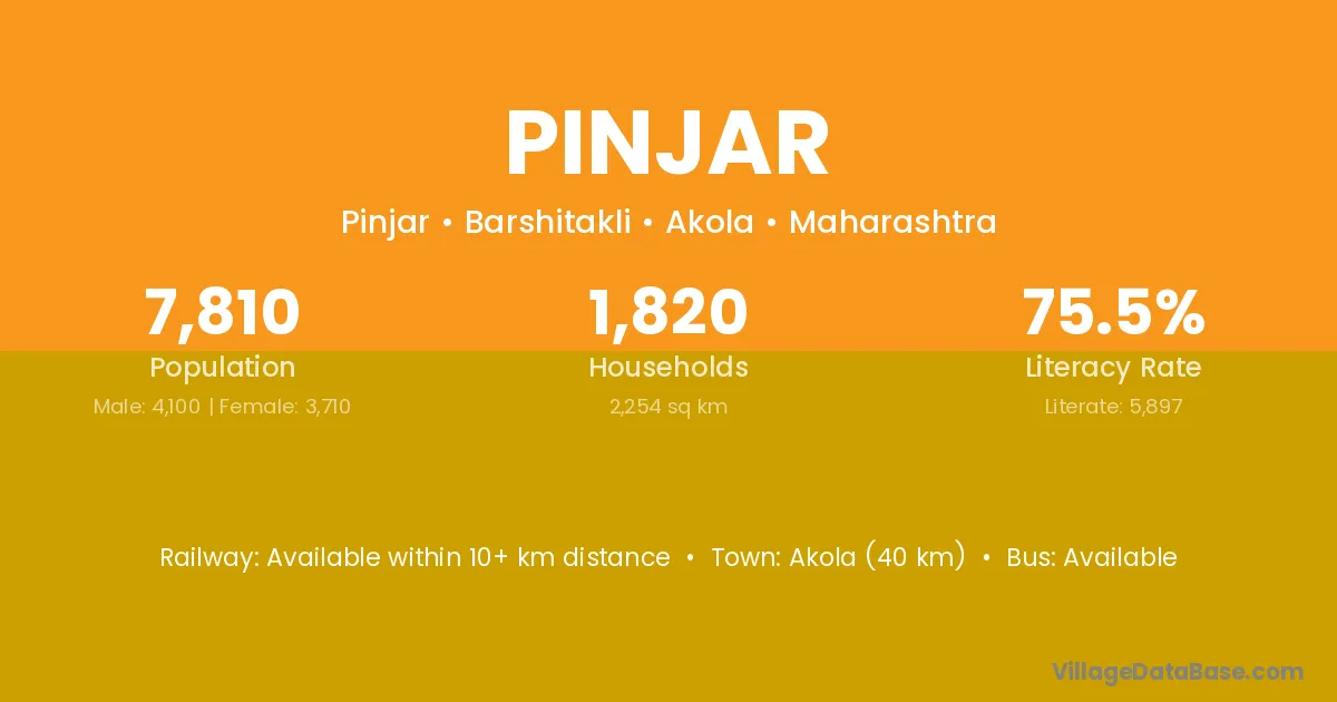 Akola (40 km) is the nearest town to Pinjar village for major economic activities and is located approximately 40 km away.