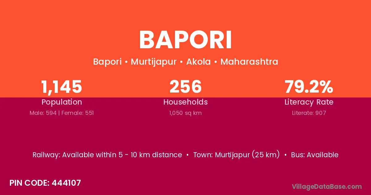 Murtijapur (25 km) is the nearest town to Bapori village for major economic activities and is located approximately 25 km away.