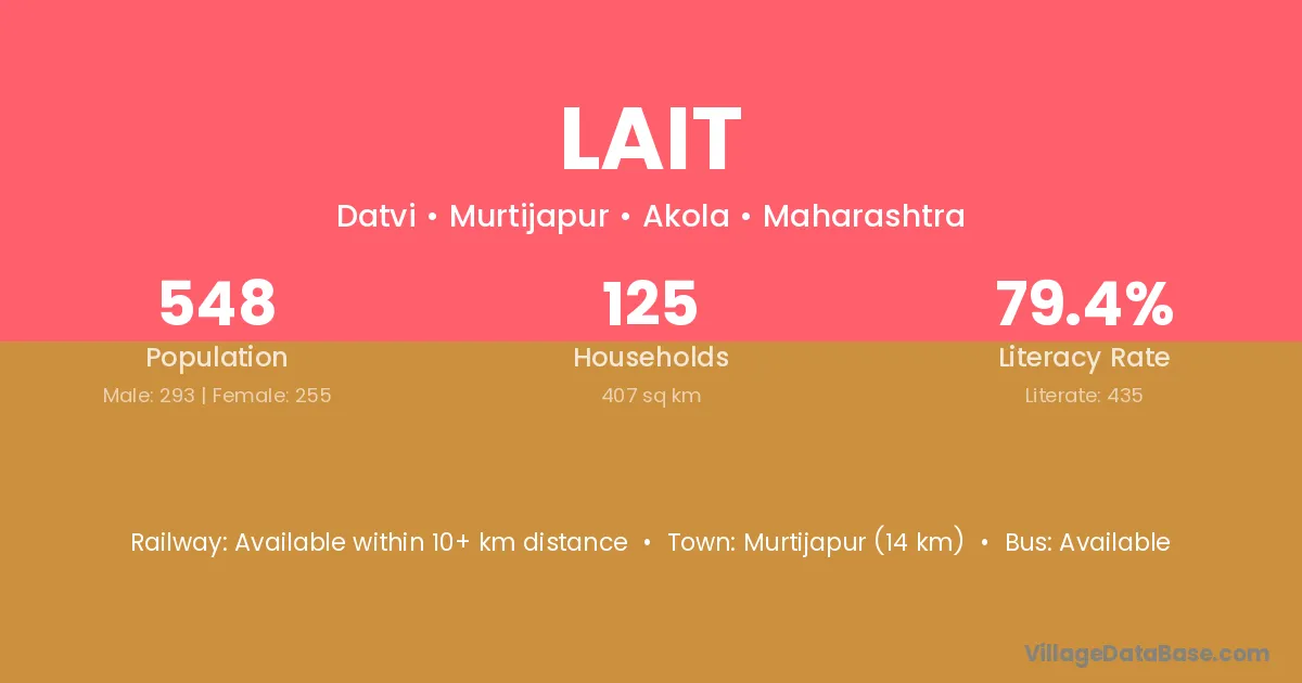 Murtijapur (14 km) is the nearest town to Lait village for major economic activities and is located approximately 14 km away.