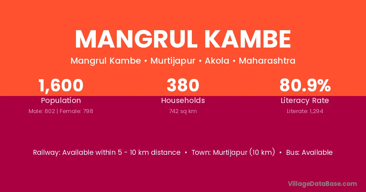 Mangrul Kambe village has a total population of 1,600 people, of which 802 are males and 798 are females.