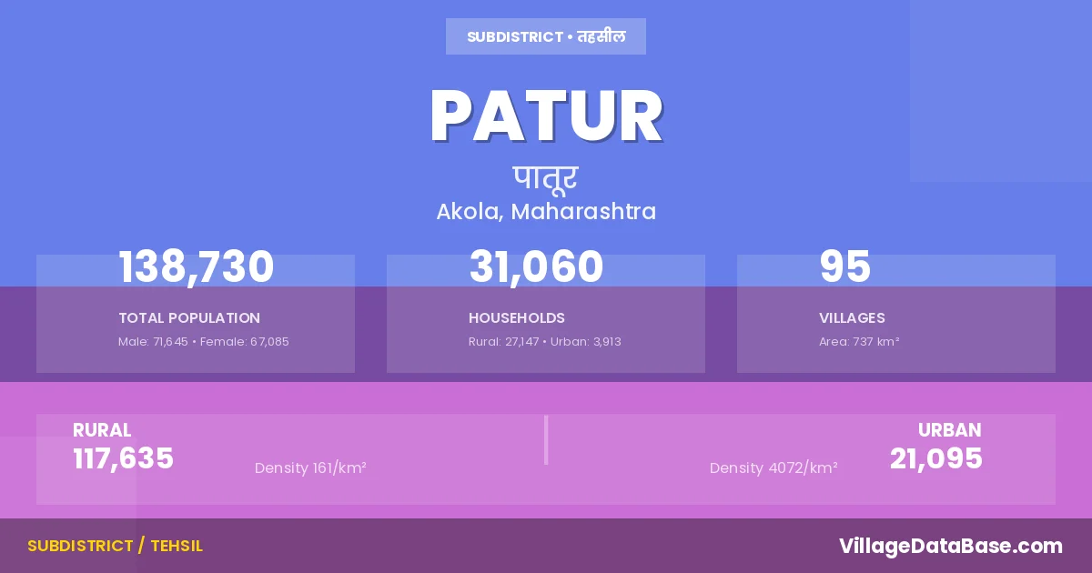 According to the 2011 census The total area of Patur Tehsil is 737 km², with a population of 138730 people. The population density is 188 inhabitants per square kilometre, and there are approximately 31060 houses in the sub district.