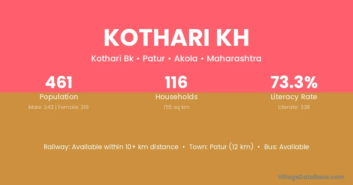 Patur (12 km) is the nearest town to Kothari Kh village for major economic activities and is located approximately 12 km away.