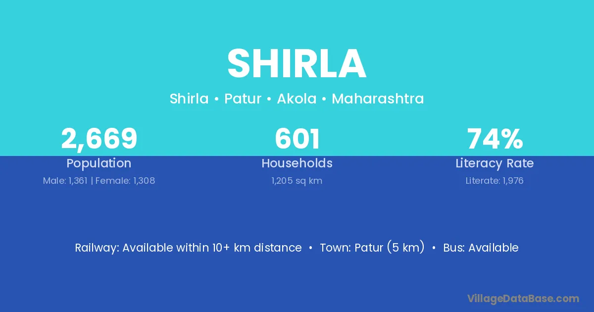 Patur (5 km) is the nearest town to Shirla village for major economic activities and is located approximately 5 km away.