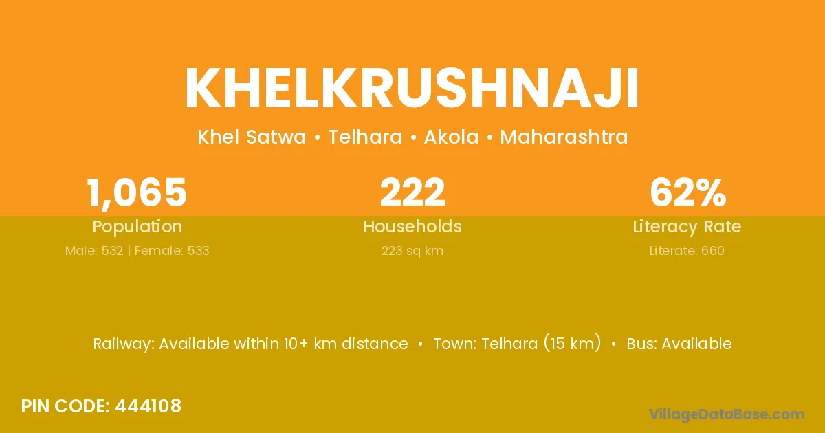 Khelkrushnaji village has a total population of 1,065 people, of which 532 are males and 533 are females.