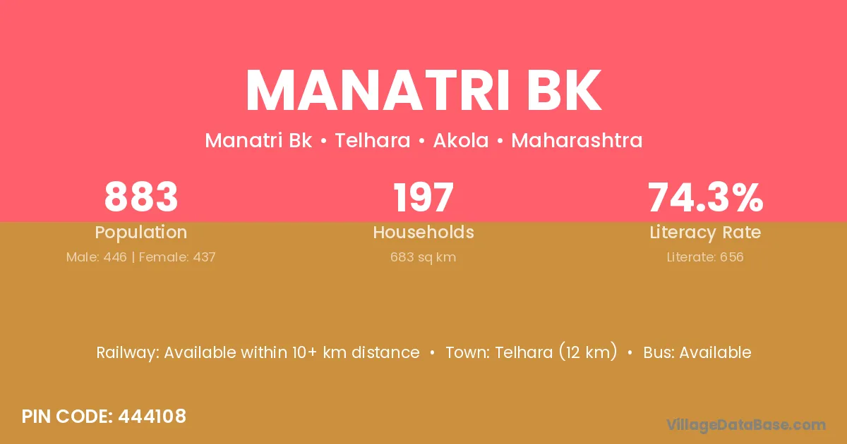 Telhara (12 km) is the nearest town to Manatri Bk village for major economic activities and is located approximately 12 km away.