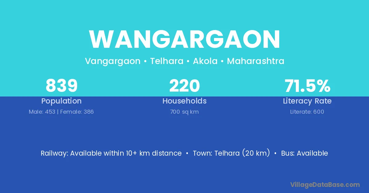 Telhara (20 km) is the nearest town to Wangargaon village for major economic activities and is located approximately 20 km away.