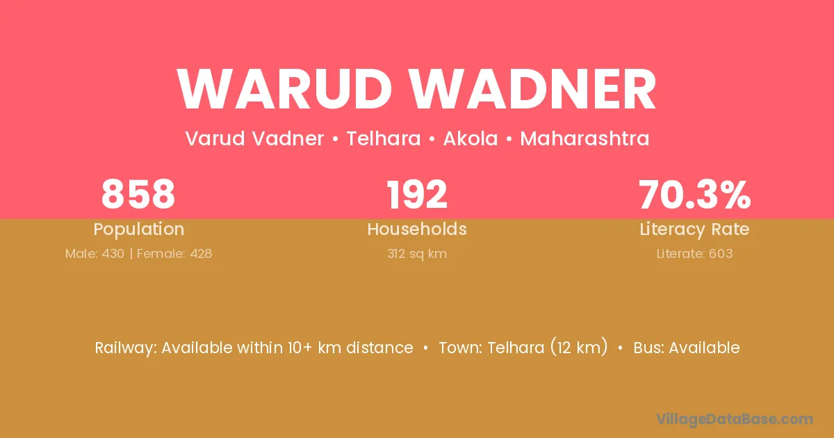 Telhara (12 km) is the nearest town to Warud Wadner village for major economic activities and is located approximately 12 km away.