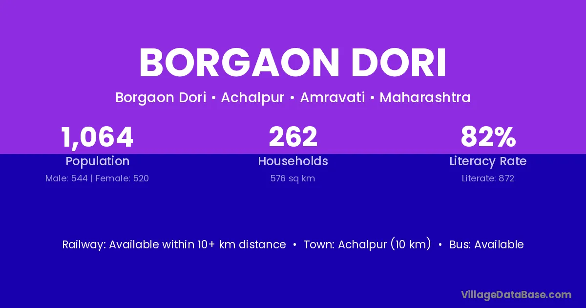 Borgaon Dori village has a total population of 1,064 people, of which 544 are males and 520 are females.