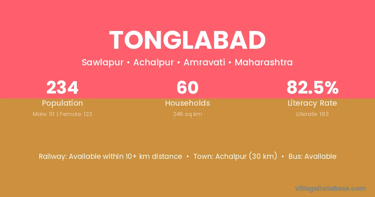 Achalpur (30 km) is the nearest town to Tonglabad village for major economic activities and is located approximately 30 km away.