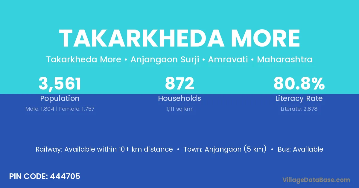 Anjangaon (5 km) is the nearest town to Takarkheda More village for major economic activities and is located approximately 5 km away.