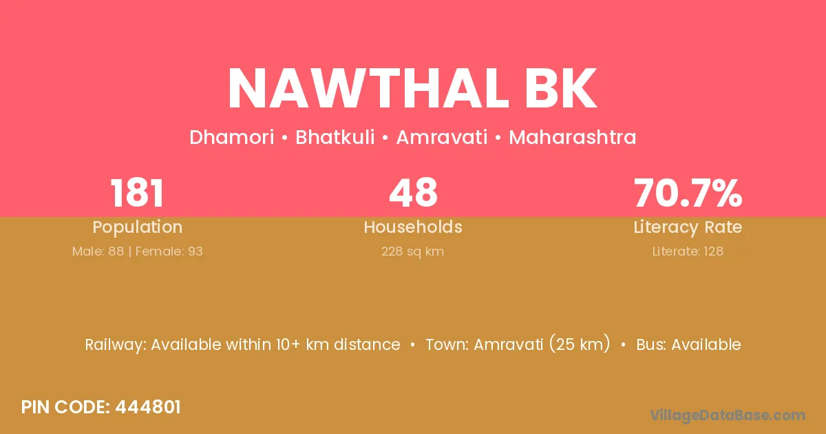 Amravati (25 km) is the nearest town to Nawthal Bk village for major economic activities and is located approximately 25 km away.