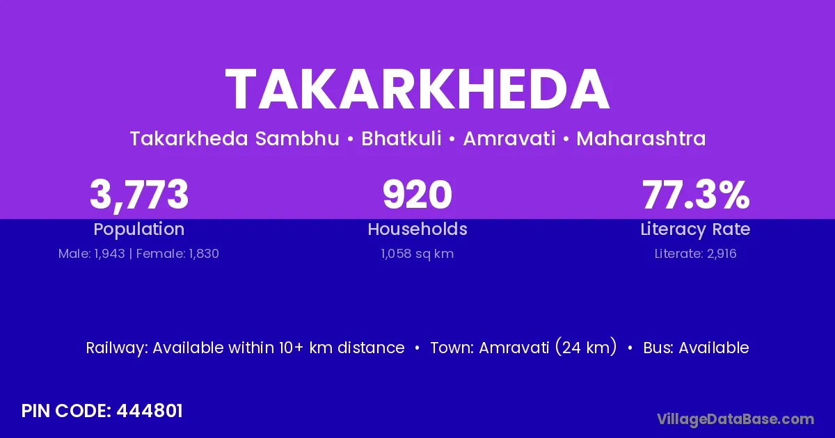 Amravati (24 km) is the nearest town to Takarkheda village for major economic activities and is located approximately 24 km away.