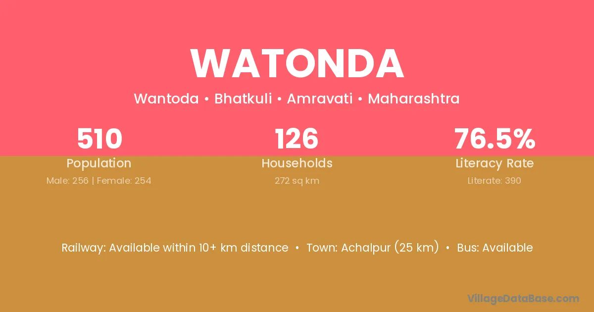Achalpur (25 km) is the nearest town to Watonda village for major economic activities and is located approximately 25 km away.