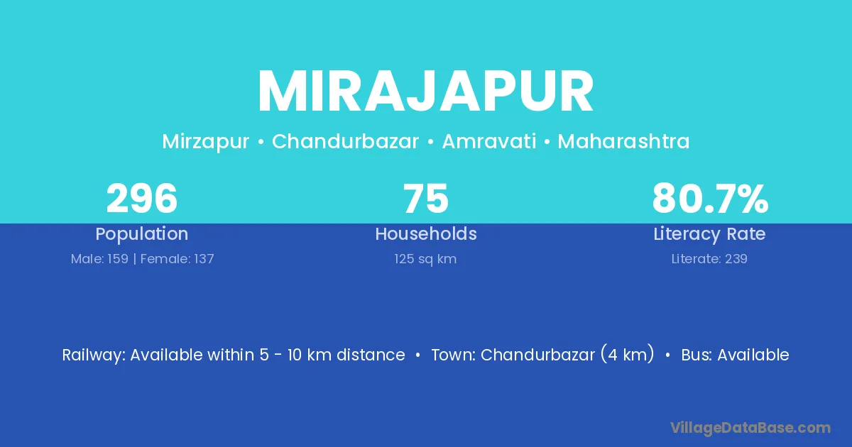 Chandurbazar (4 km) is the nearest town to Mirajapur village for major economic activities and is located approximately 4 km away.