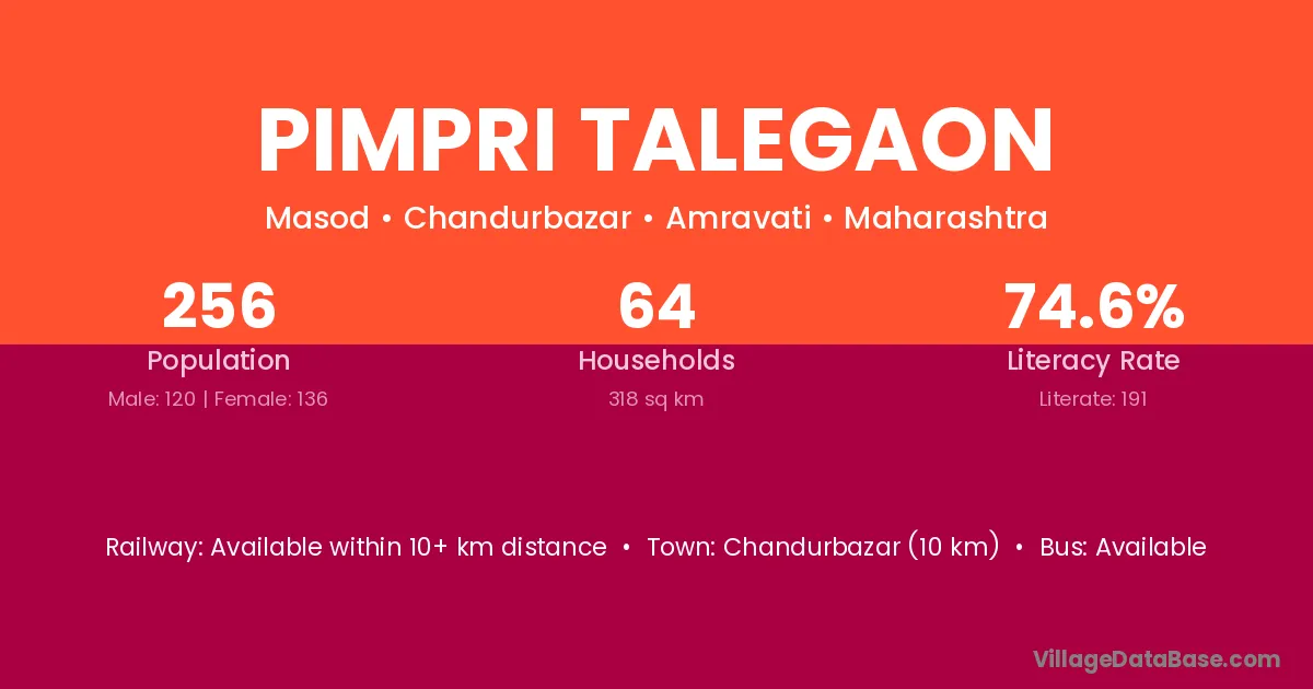 Pimpri Talegaon village has a total population of 256 people, of which 120 are males and 136 are females.