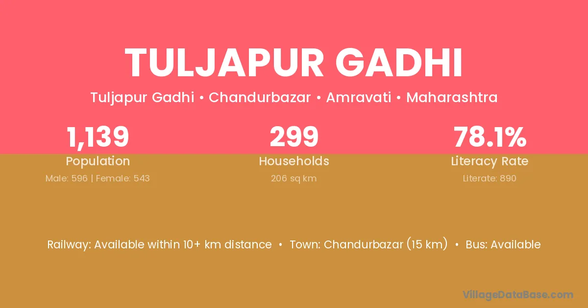Tuljapur Gadhi village has a total population of 1,139 people, of which 596 are males and 543 are females.