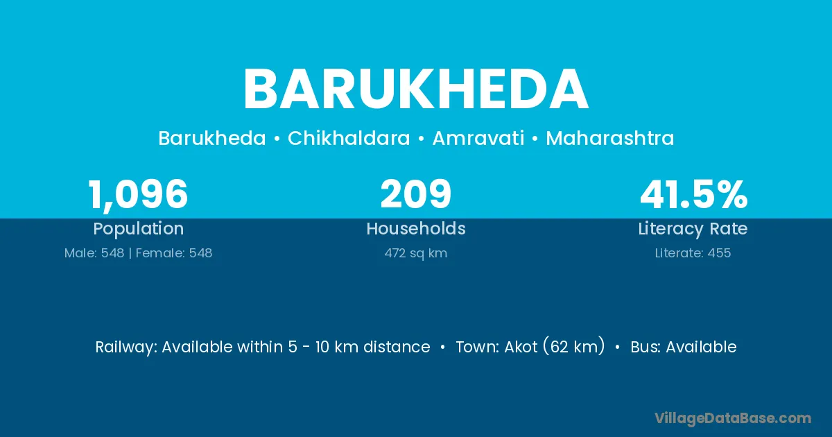 Akot (62 km) is the nearest town to Barukheda village for major economic activities and is located approximately 62 km away.