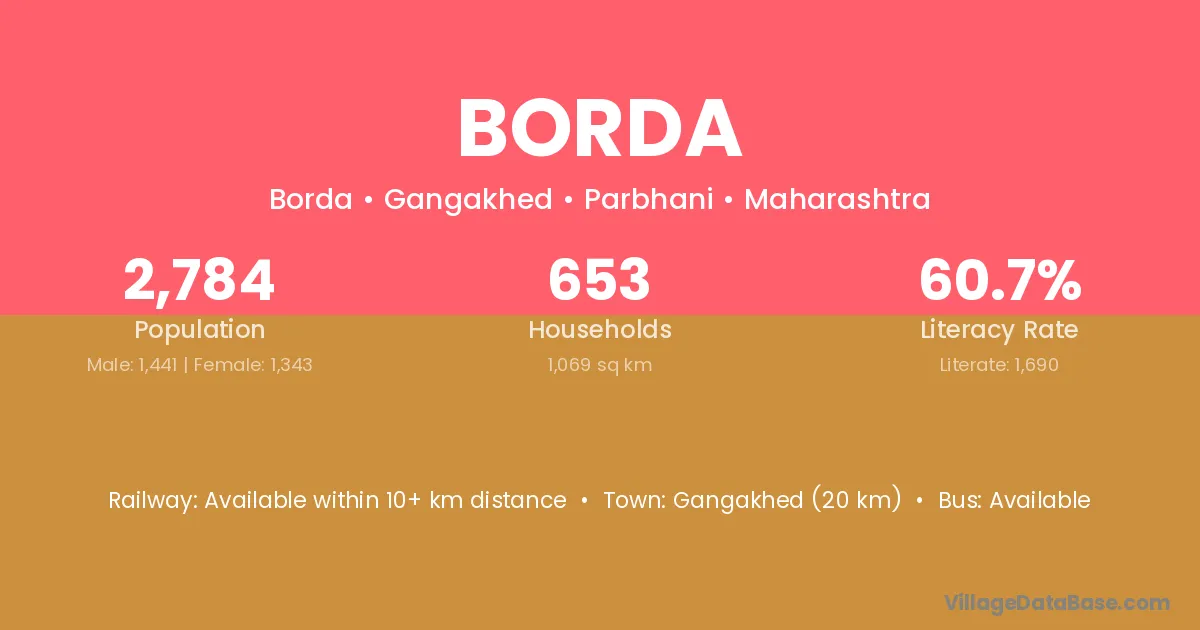 The literacy rate of Borda village is 38.49%. Male literacy stands at 42.17% and female literacy at 35.08%.