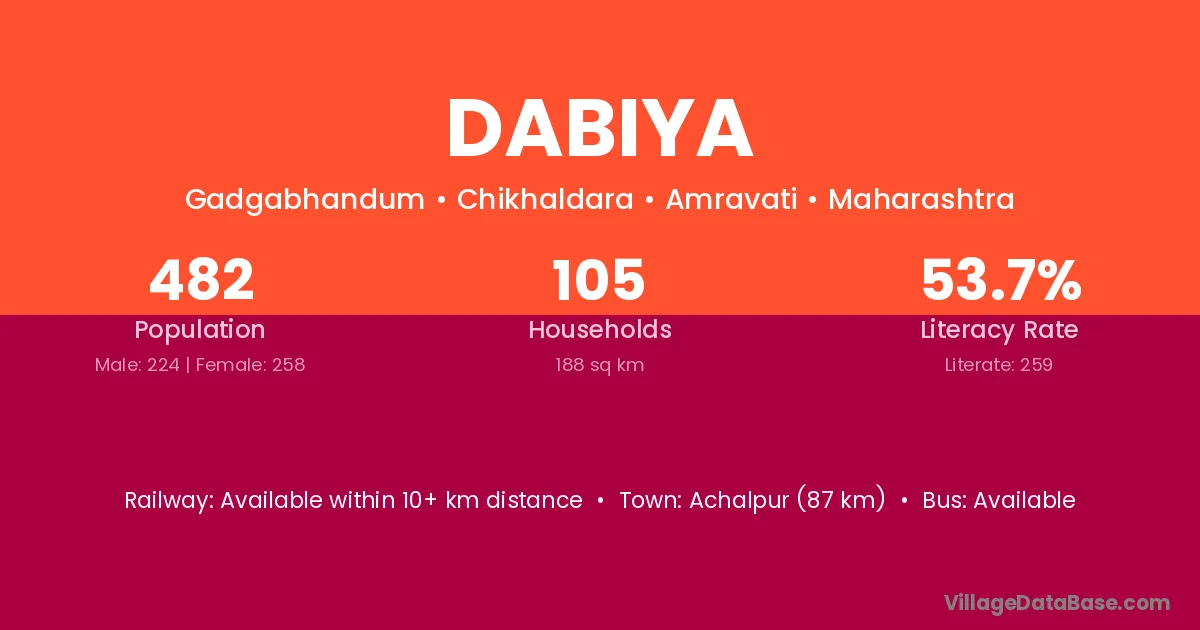Achalpur (87 km) is the nearest town to Dabiya village for major economic activities and is located approximately 87 km away.