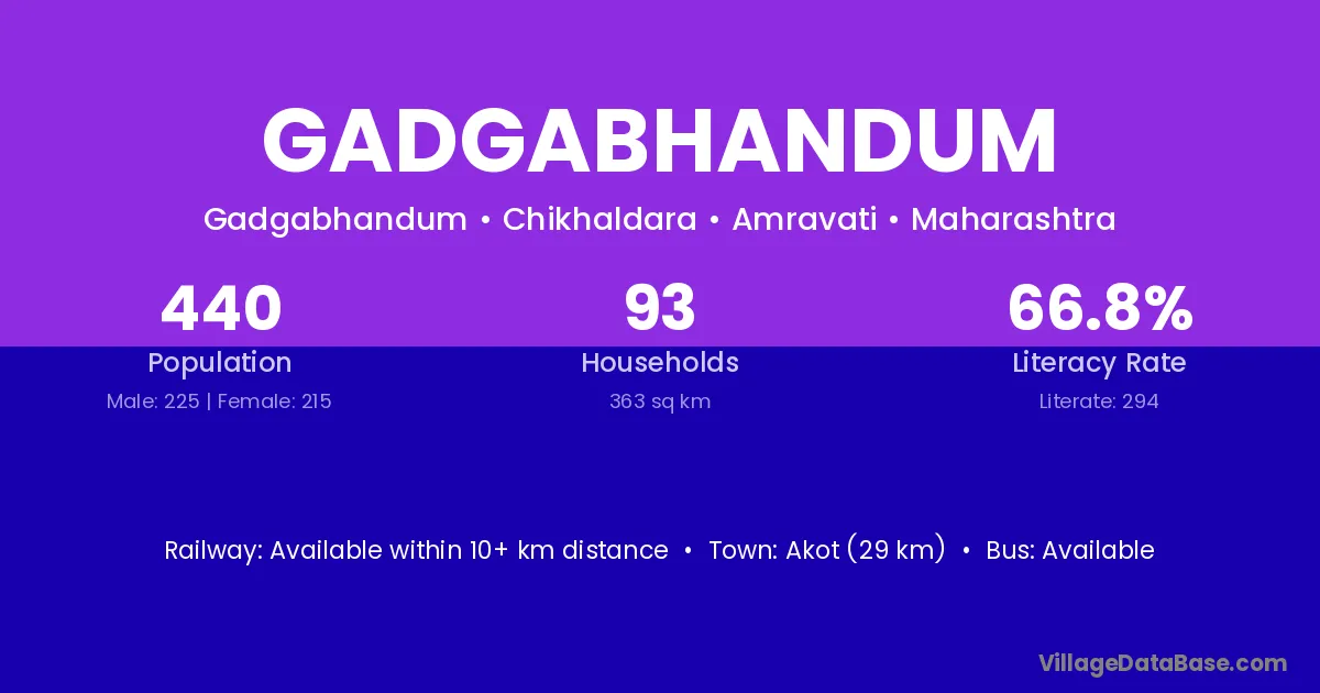 Akot (29 km) is the nearest town to Gadgabhandum village for major economic activities and is located approximately 29 km away.