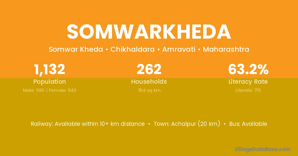 Achalpur (20 km) is the nearest town to Somwarkheda village for major economic activities and is located approximately 20 km away.