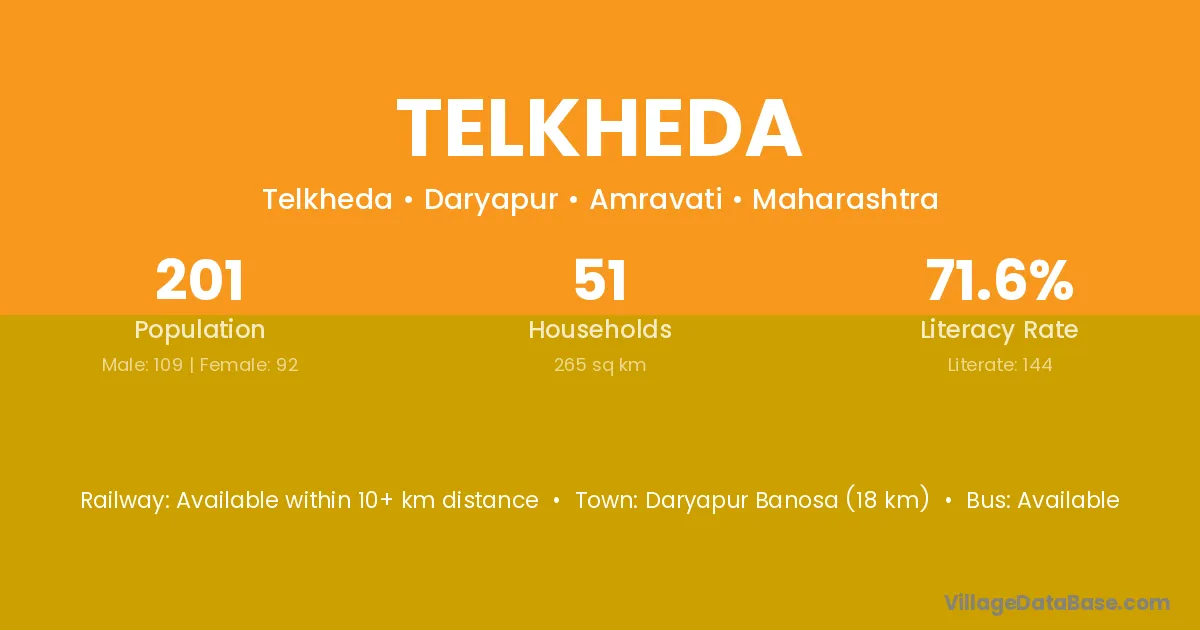 Daryapur Banosa (18 km) is the nearest town to Telkheda village for major economic activities and is located approximately 18 km away.