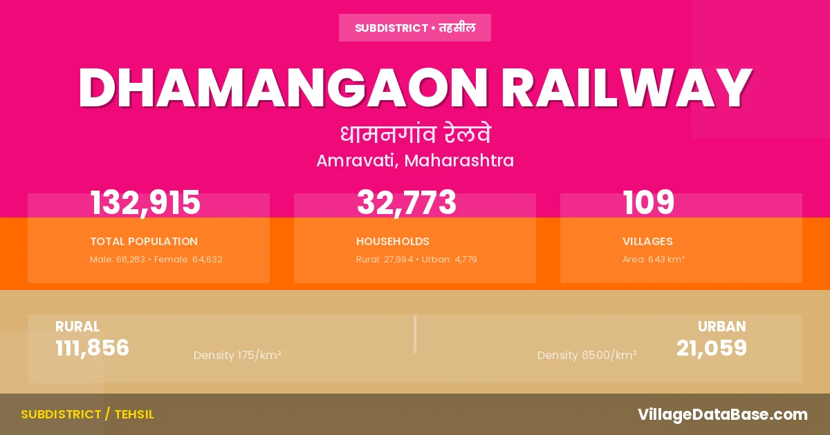 According to the 2011 census The total area of Dhamangaon Railway Tehsil is 643 km², with a population of 132915 people. The population density is 207 inhabitants per square kilometre, and there are approximately 32773 houses in the sub district.