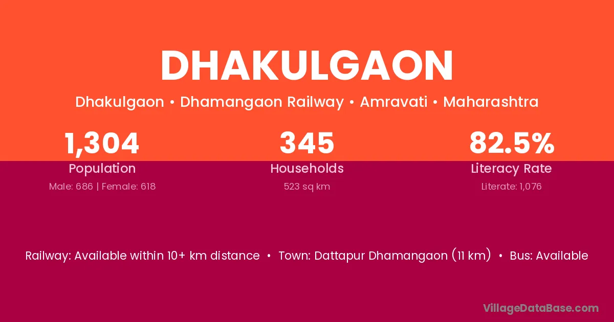 Dattapur Dhamangaon (11 km) is the nearest town to Dhakulgaon village for major economic activities and is located approximately 11 km away.