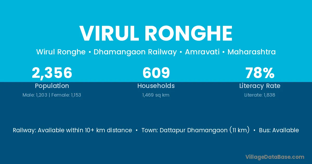Dattapur Dhamangaon (11 km) is the nearest town to Virul Ronghe village for major economic activities and is located approximately 11 km away.